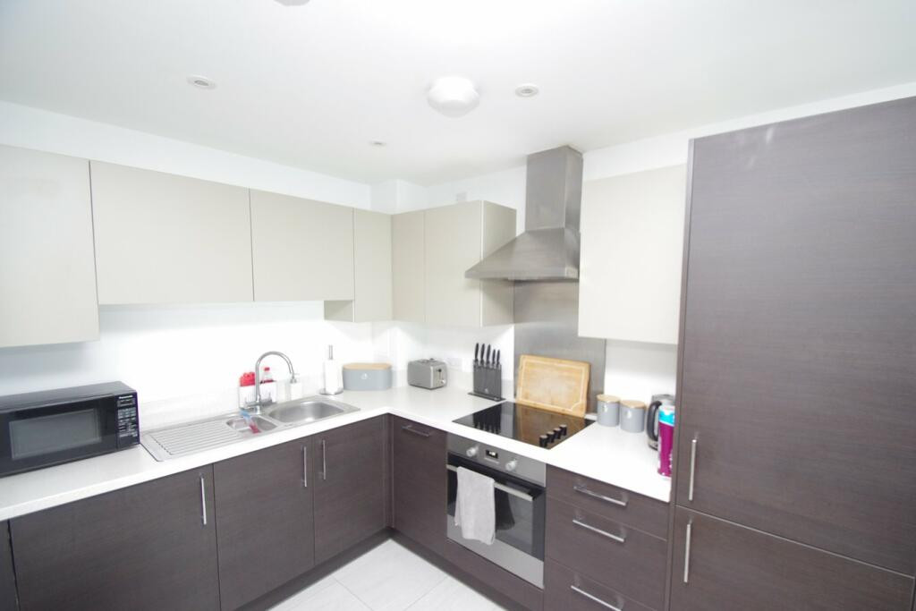 the front is a modern fitted kitchen with an integrated cooker/hob and